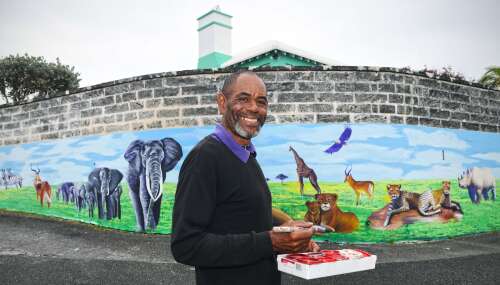 Dennis Joaquin’s Savannah, a mural in his neighbourhood on Keith hall Estate Road, will be finished my this summer (Photograph from Bernews)